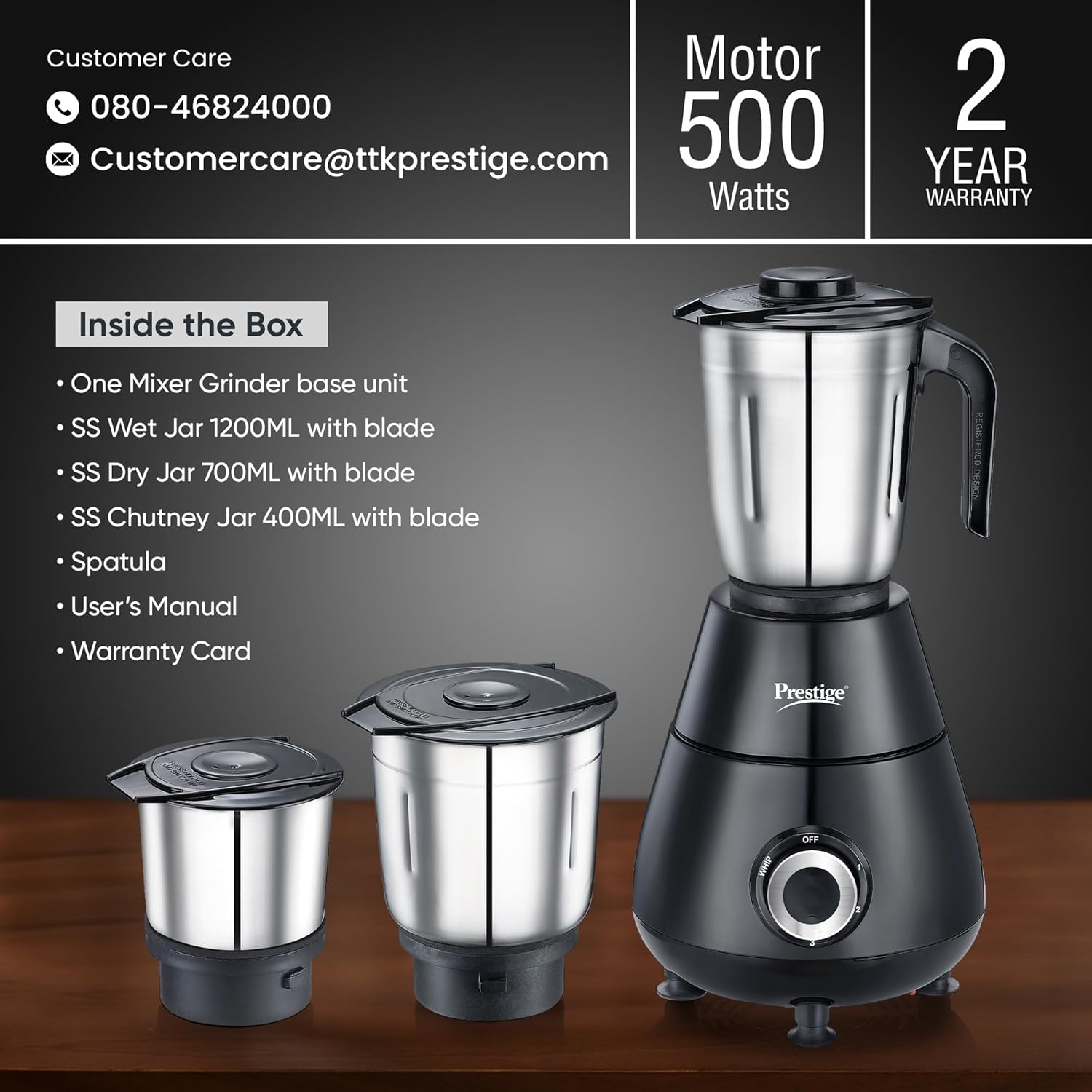𝟯 𝗦𝗧𝗔𝗜𝗡𝗟𝗘𝗦𝗦 𝗦𝗧𝗘𝗘𝗟 𝗝𝗔𝗥𝗦 𝗙𝗢𝗥 𝗩𝗘𝗥𝗦𝗔𝗧𝗜𝗟𝗘 𝗨𝗦𝗘:Includes a 1200ml wet jar, 700ml dry jar, and 400ml chutney jar, crafted from food-grade stainless steel with sturdy handles for comfortable grip and durability. Ideal for daily grinding, blending, and mixing needs.