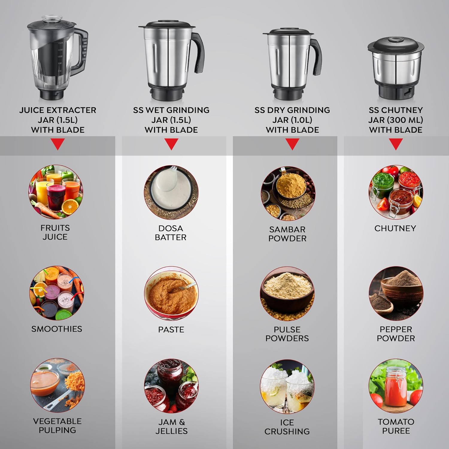 𝟱 𝗠𝗨𝗟𝗧𝗜-𝗣𝗨𝗥𝗣𝗢𝗦𝗘 𝗝𝗔𝗥𝗦 𝗜𝗡𝗖𝗟𝗨𝗗𝗜𝗡𝗚 𝗠𝗜𝗫-𝗢-𝗞𝗘𝗘𝗣: Comes with 3 Stainless Steel jars (1.5L wet, 1L dry, 300ml chutney), a 1.5L transparent juicer jar, and a Mix-O-Keep jar—perfect for storing freshly ground spices, chutneys, or pastes.