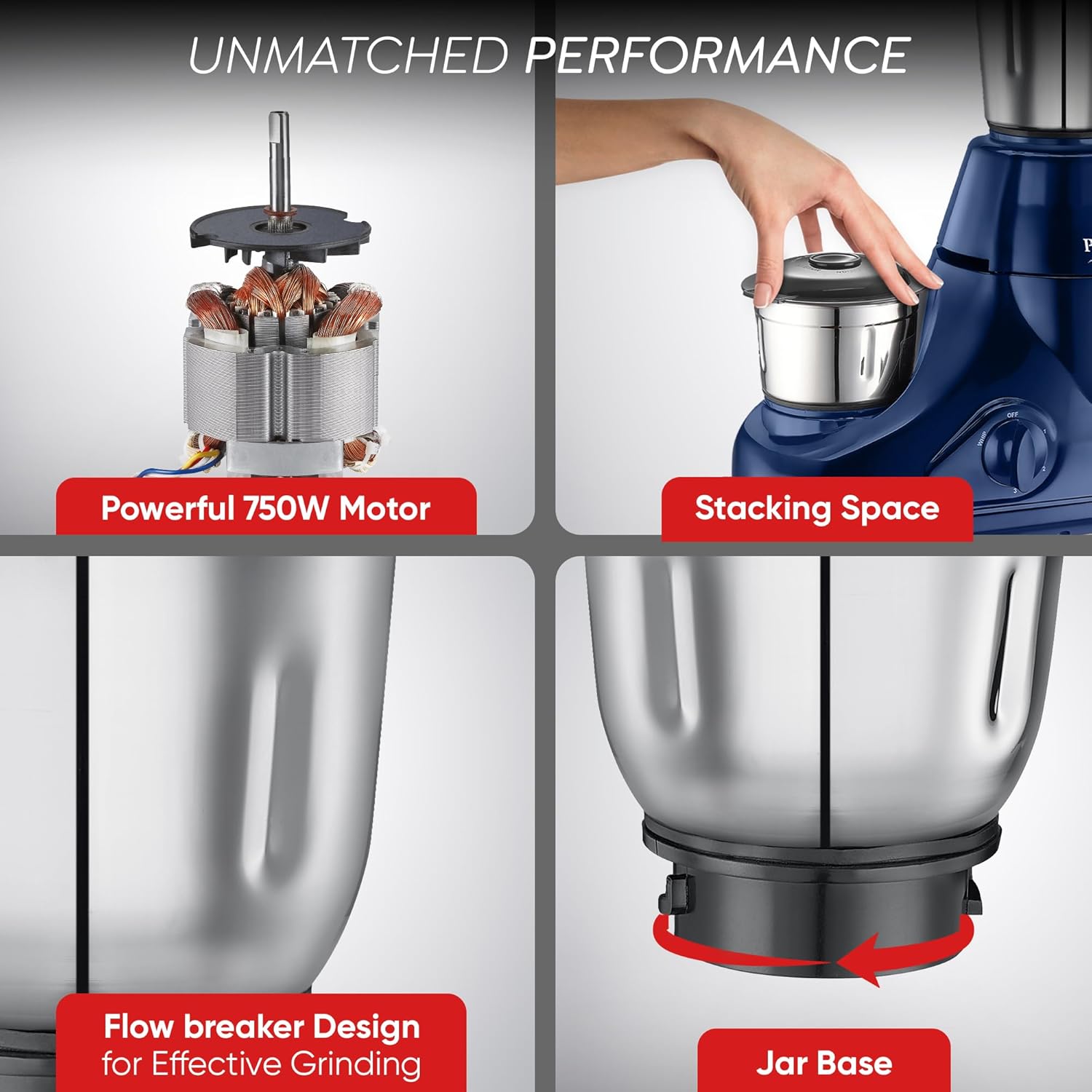 Prestige Astra 750 Watt Mixer Grinder with 5 Jars (3 Stainless Steel + 1 Juicer + 1 Mix-O-Keep) | Space-Saving Stacking Design | Blue | 2Y Warranty | ISI Certified