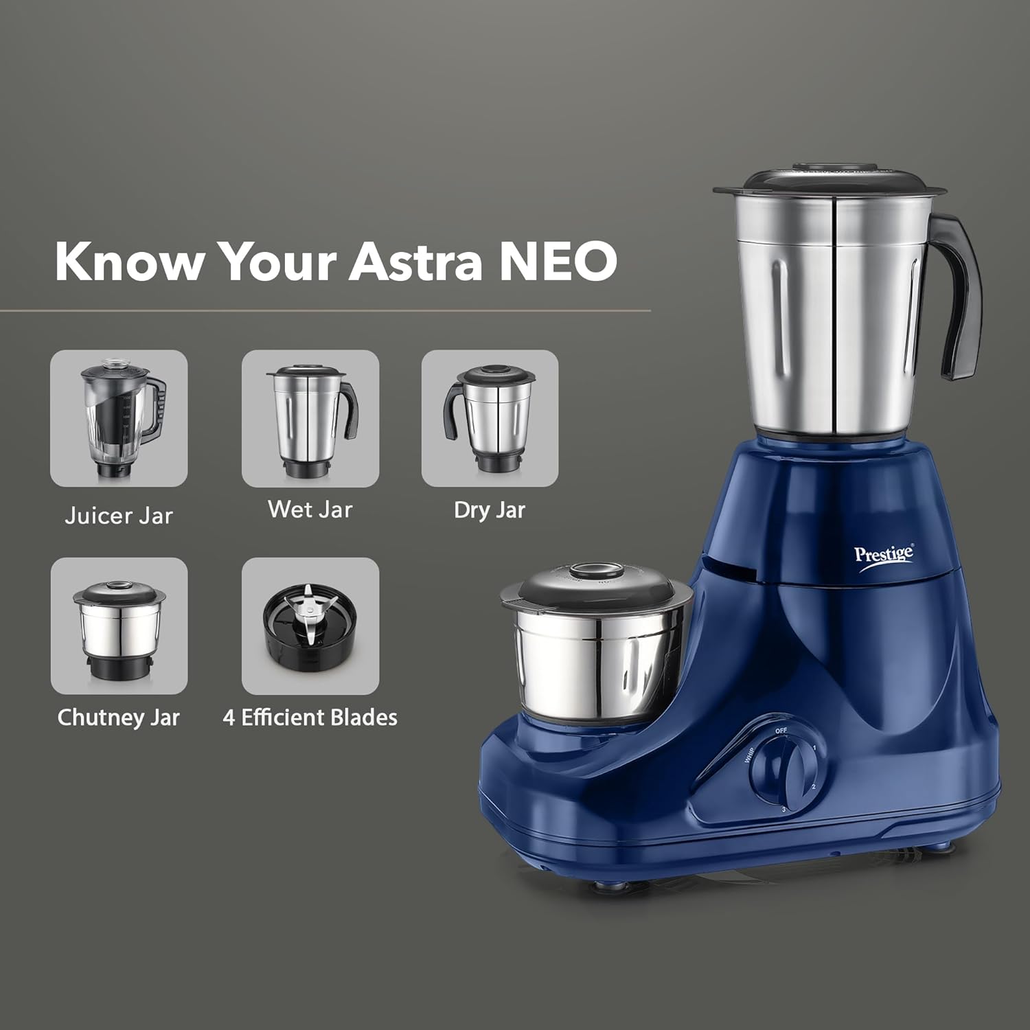 Prestige Astra Neo 750W Mixer Grinder with 4 Jars (3 Stainless Steel + 1 Juicer) | Space-Saving Stacking Design | Super Efficient SS Blades | Blue |2Y Warranty | ISI Certified